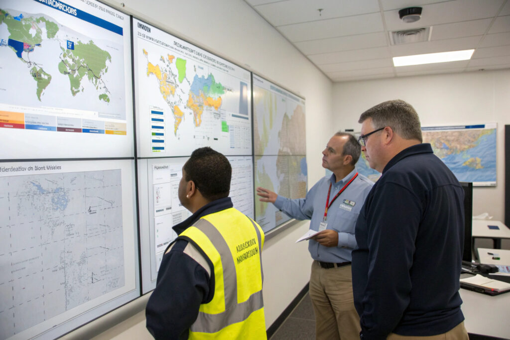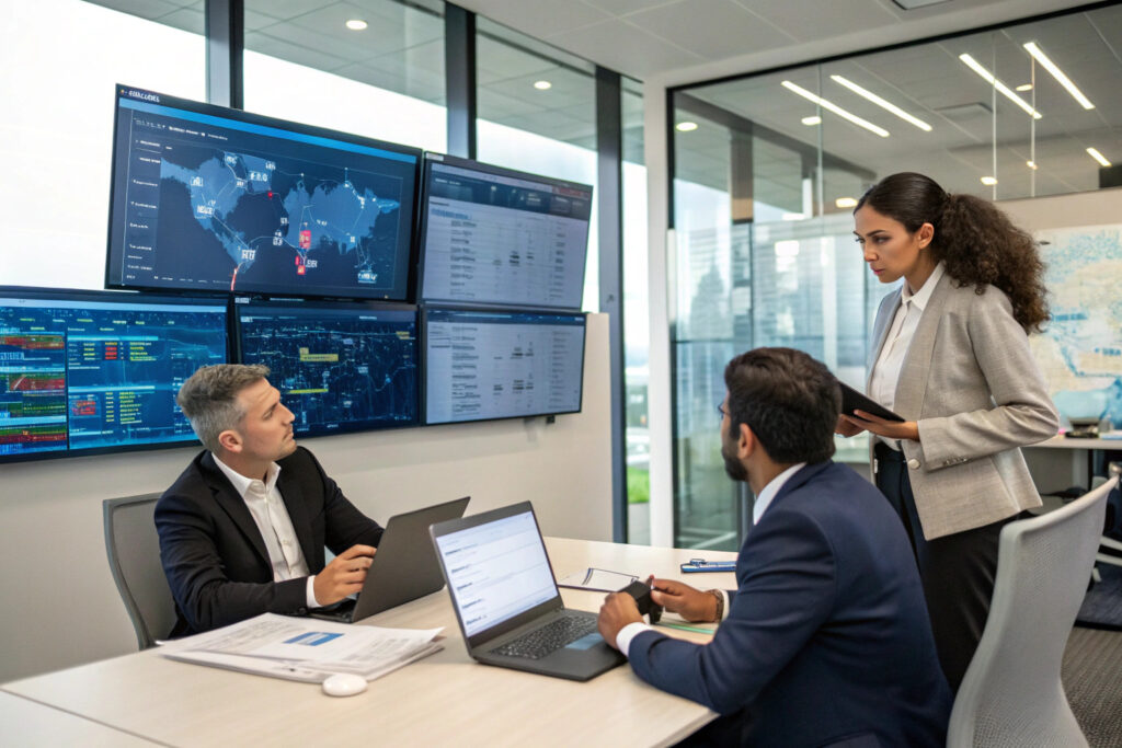 The scene shows detailed supply chain mapping on digital displays, audit reports being reviewed, and team discussions about risk assessment findings.
