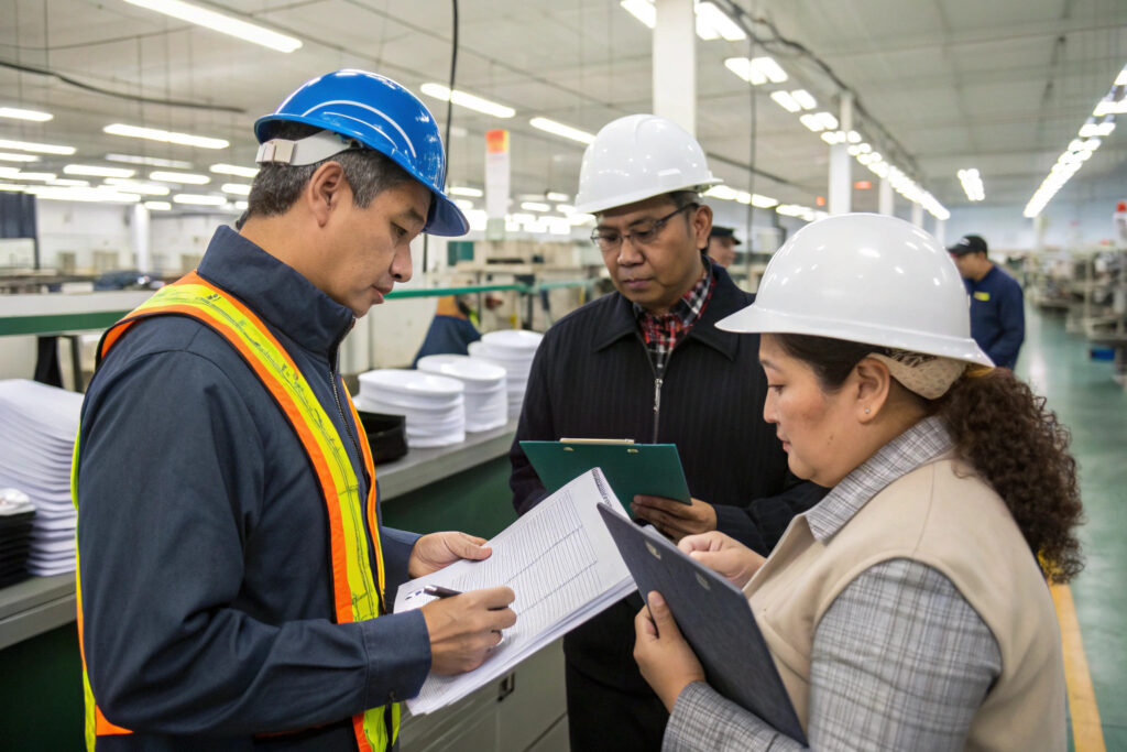 The scene demonstrates professional, thorough assessment practices with clear communication between auditors and factory management.