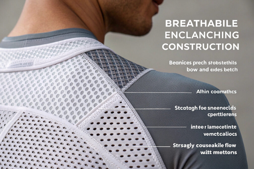 Breathability-enhancing construction includes seamless mesh integration, strategic stitching patterns, minimal internal structure, and assembly methods that prevent airflow obstruction.