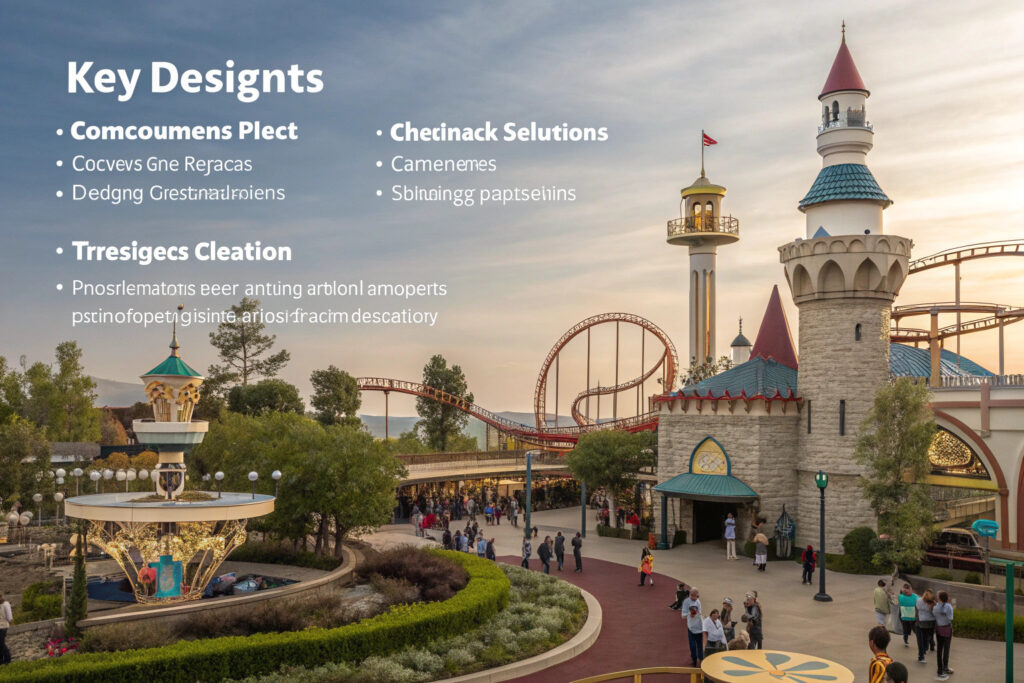 Key design elements include exaggerated proportions for theatrical effect, integrated shade solutions, character integration, and strategic branding placement that maintains cultural appeal while supporting park themes and IP integration.