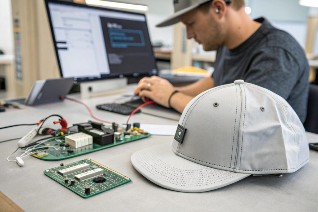 Integration is where apparel engineering meets electronics. The module cannot simply be sewn into a lining. It requires a dedicated, padded “contact pocket” at the temple that holds the transducer firmly yet comfortably against the head. Wiring must be routed through the cap’s structure (e.g., within the seam tape or a dedicated channel) to a control unit, which is often placed at the rear or on the visor. The battery pack needs to be securely housed, often in a rear compartment, to distribute weight evenly. This requires close collaboration between your headwear designers and the tech supplier’s engineers.