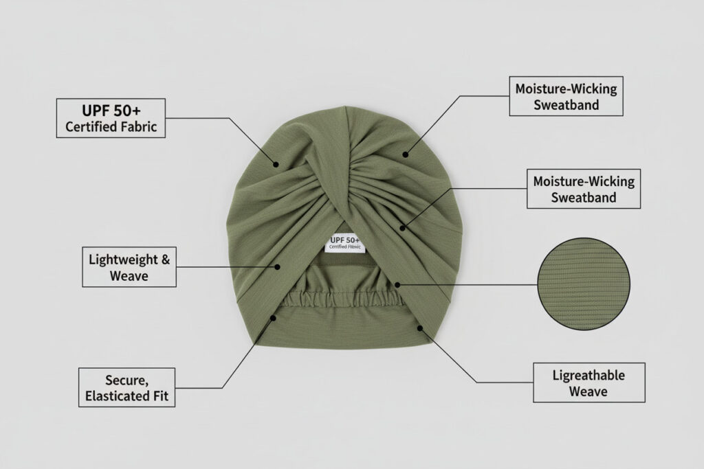 A truly effective turban cap for outdoor workers is defined by more than just its UPF rating. It's an integrated system of features designed for performance, comfort, and safety. The three most critical elements to scrutinize are the fabric's technical properties beyond UV protection, the design's fit and coverage, and the product's official certifications. A quality cap should not only block the sun but also manage sweat, stay securely in place during active work, and have the lab-tested proof to back up its claims.