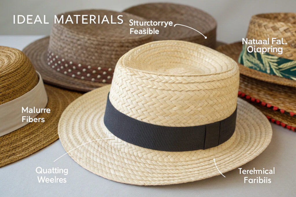 Ideal materials include structured yet flexible natural fibers, substantial felts, quality straw weaves, and technical fabrics that maintain shape while offering comfort. Construction elements like internal bands and proper interfacing ensure consistent fit and appearance.