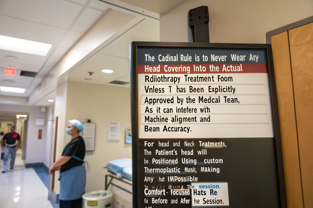 The cardinal rule is to never wear any head covering into the actual radiotherapy treatment room unless it has been explicitly approved by the medical team, as it can interfere with machine alignment and beam accuracy. For head and neck treatments, the patient's head will be positioned using a custom thermoplastic mask, making any hat impossible to wear during the session itself. Comfort-focused hats are for before and after the session.