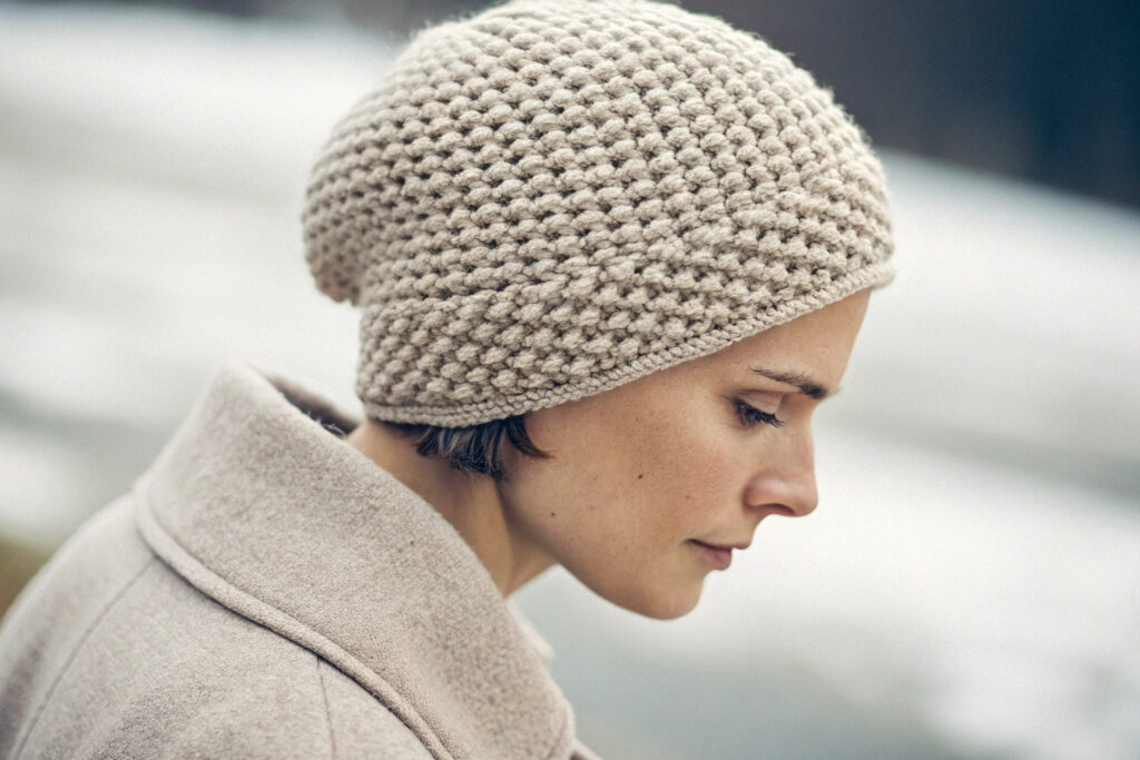 This stitch shines when made with a soft, thicker yarn, like a merino wool blend, a soft acrylic, or a recycled polyester. It's most popular in a classic cuffed beanie silhouette or a slightly taller, "slouchy" style. The volume of the stitch naturally creates a beautiful, relaxed drape.