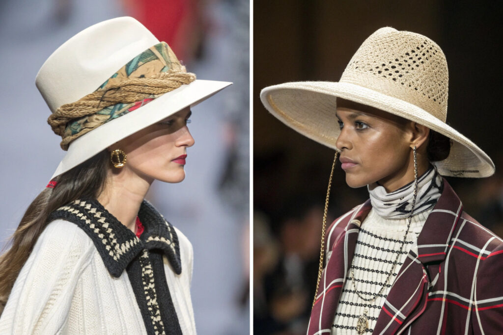 - Neck-focused draping that transforms hats into shoulder-grazing statements