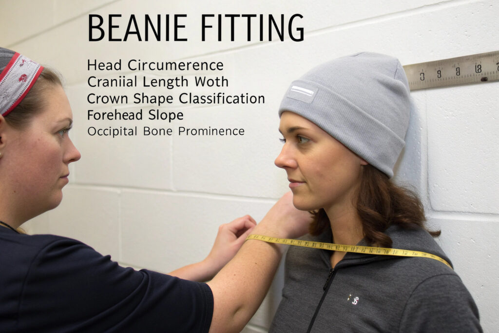 Critical biometric measurements for beanie fitting include head circumference at multiple positions, cranial length and width, crown shape classification, forehead slope, and occipital bone prominence. Together, these measurements ensure the beanie maintains proper position without excessive tightness or slippage.