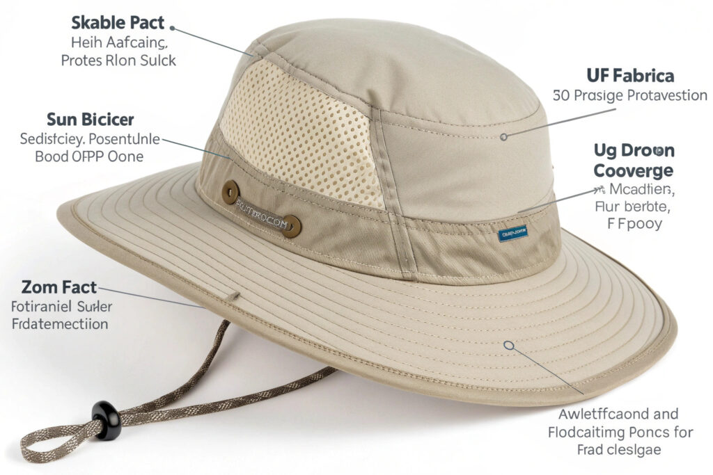 Beyond fabric UPF ratings, specific design elements significantly impact the actual sun protection provided by wide brim hats. Understanding these features helps you select manufacturers with both technical and design expertise.