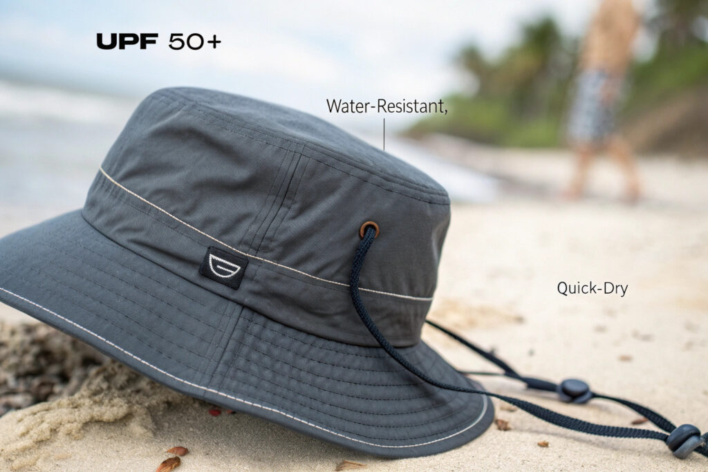 True surf-grade bucket hats combine UPF 50+ materials with water-resistant treatments, reinforced stitching, secure attachment systems, and quick-dry capabilities. These features ensure protection remains effective during ocean activities and the hat survives the harsh beach environment.